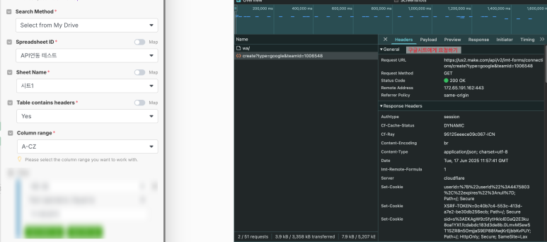 MAKE에게 주황색을 보이는 트리 구조 결과값 를 보내줘서 화면에 SpreadsheetID: API연동테스트 SheetName :시트1이 나타나게 되는겁니다